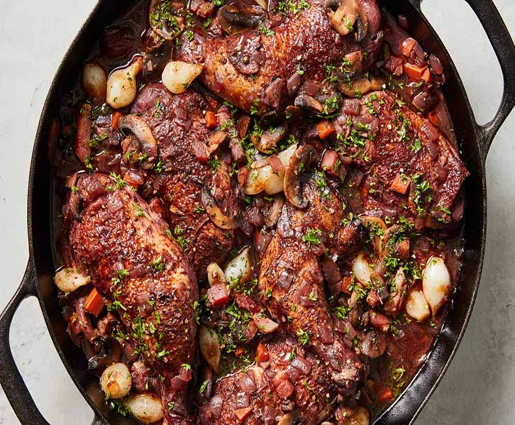 No list of classic French dishes would be complete without Coq au Vin. This slow-cooked dish consists of chicken braised in red wine, with bacon, mushrooms, and onions. The richness of the wine sauce and the tenderness of the chicken make it a comforting and satisfying meal. The dish is rooted in French country cooking and is the epitome of homey, hearty French cuisine.