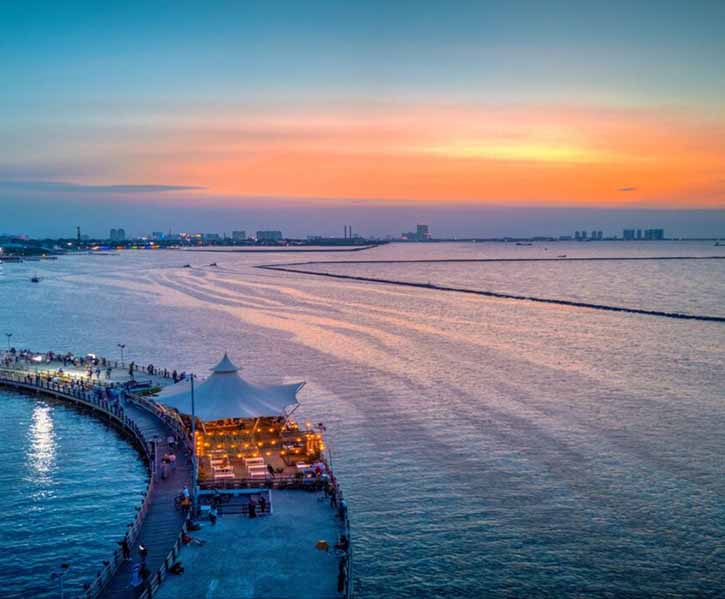 As the evening rolled in and the blue hour arrived, I discovered an incredible photo spot by the beach at Ancol Dreamland. There’s a small wooden boardwalk that stretches gently into the sea. Surrounded by lush tropical plants, the boardwalk leads to the vast, endless ocean and the bright blue sky. The last rays of the sunset bathe the water in golden hues, creating a breathtaking, almost magical scene.